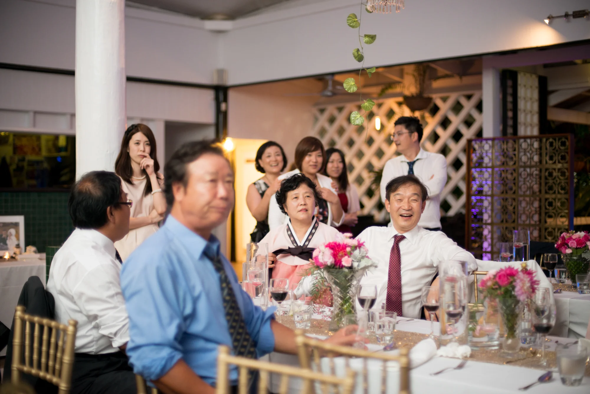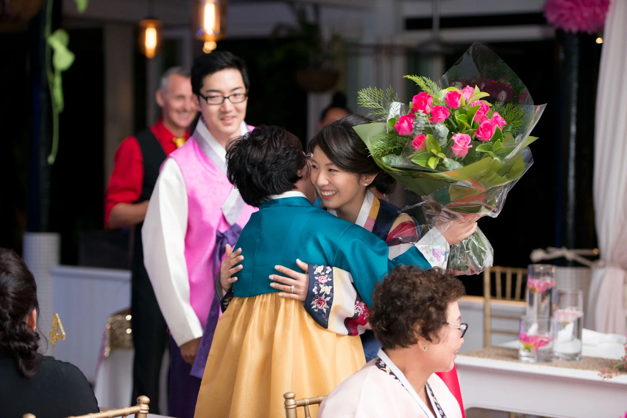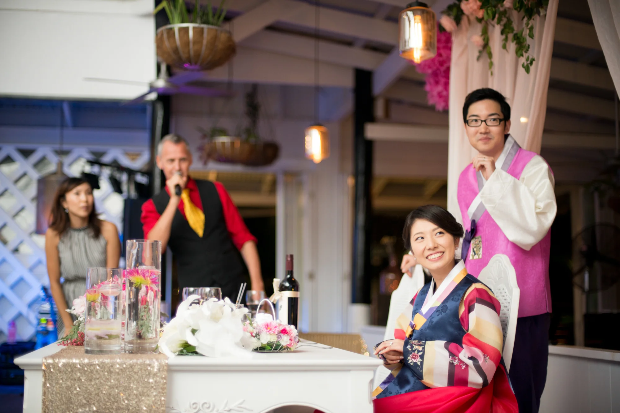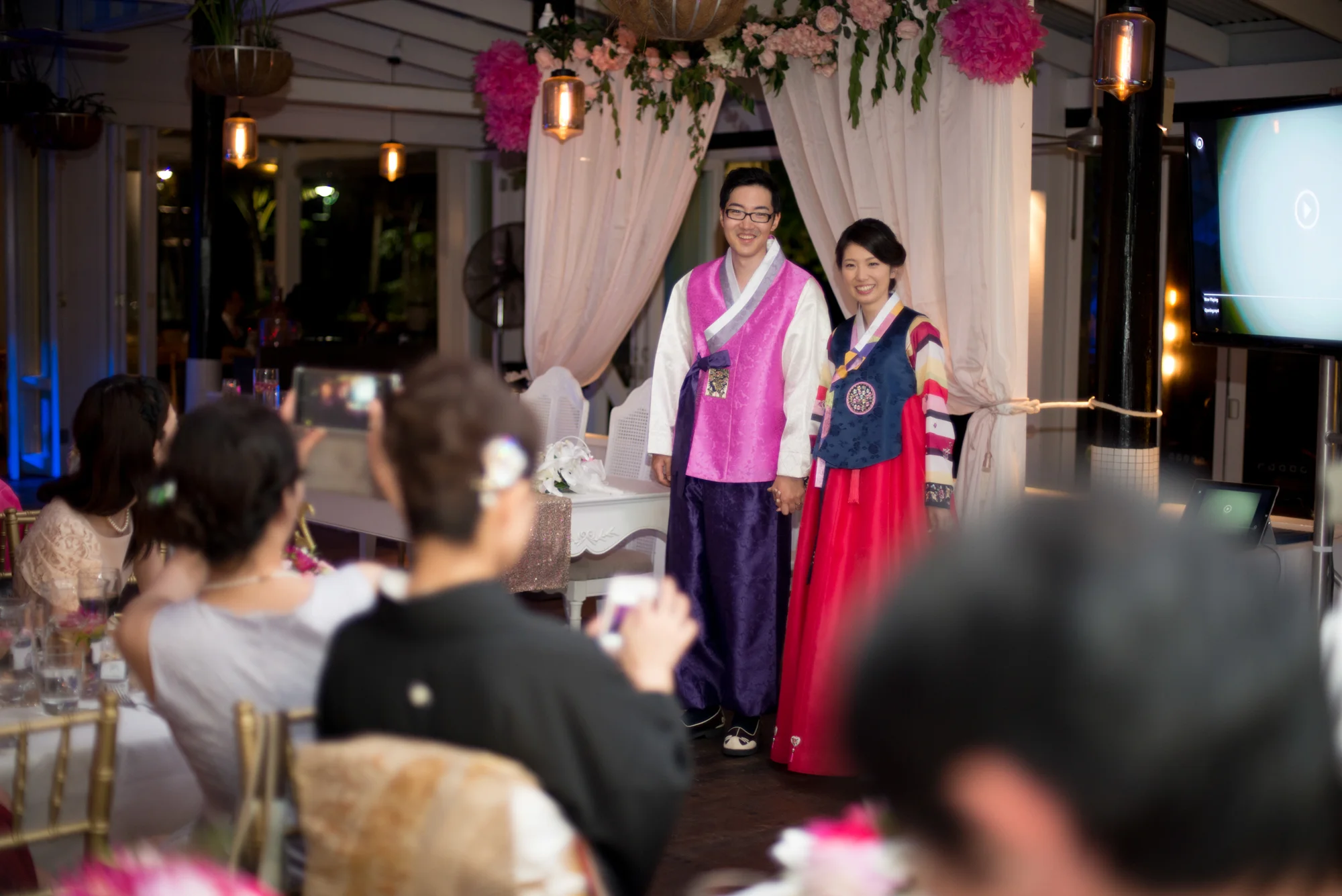 ゲストがお食事を楽しまれている間に、新郎新婦様は、ご両家のご親族にサプライズでお召しになるチマチョゴリに、お色直しに出られました。