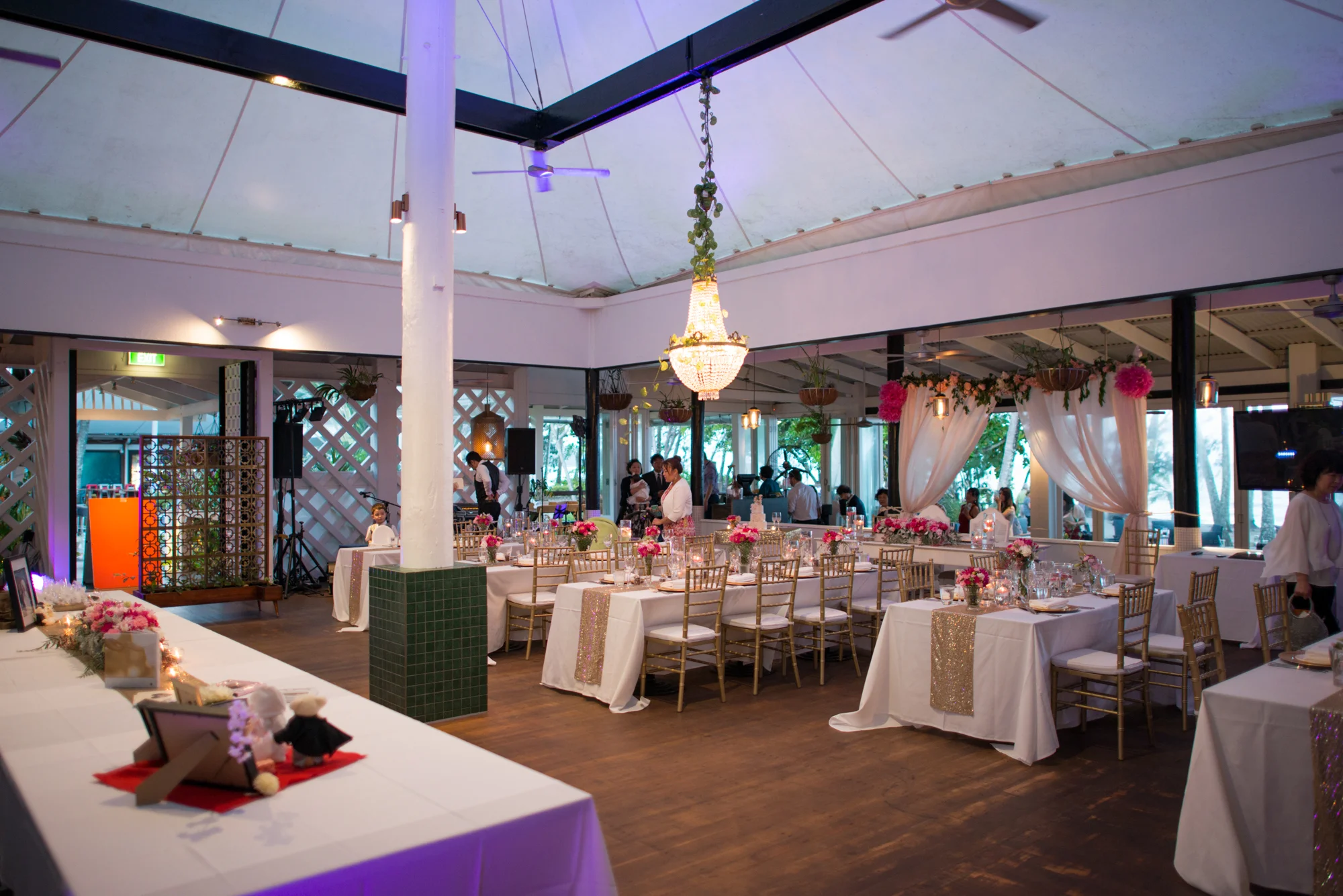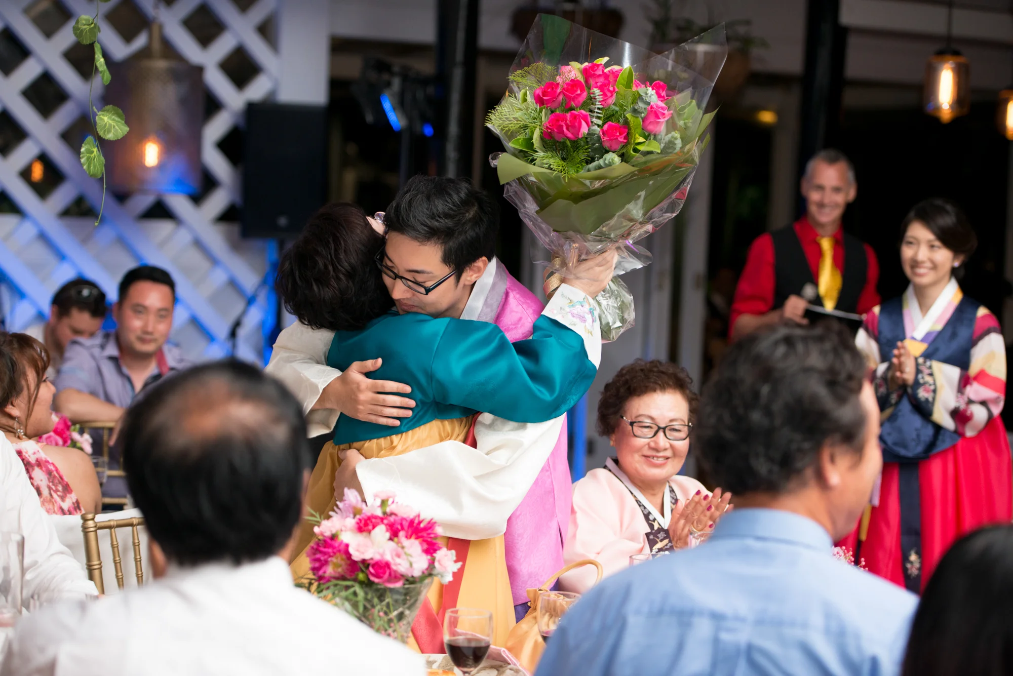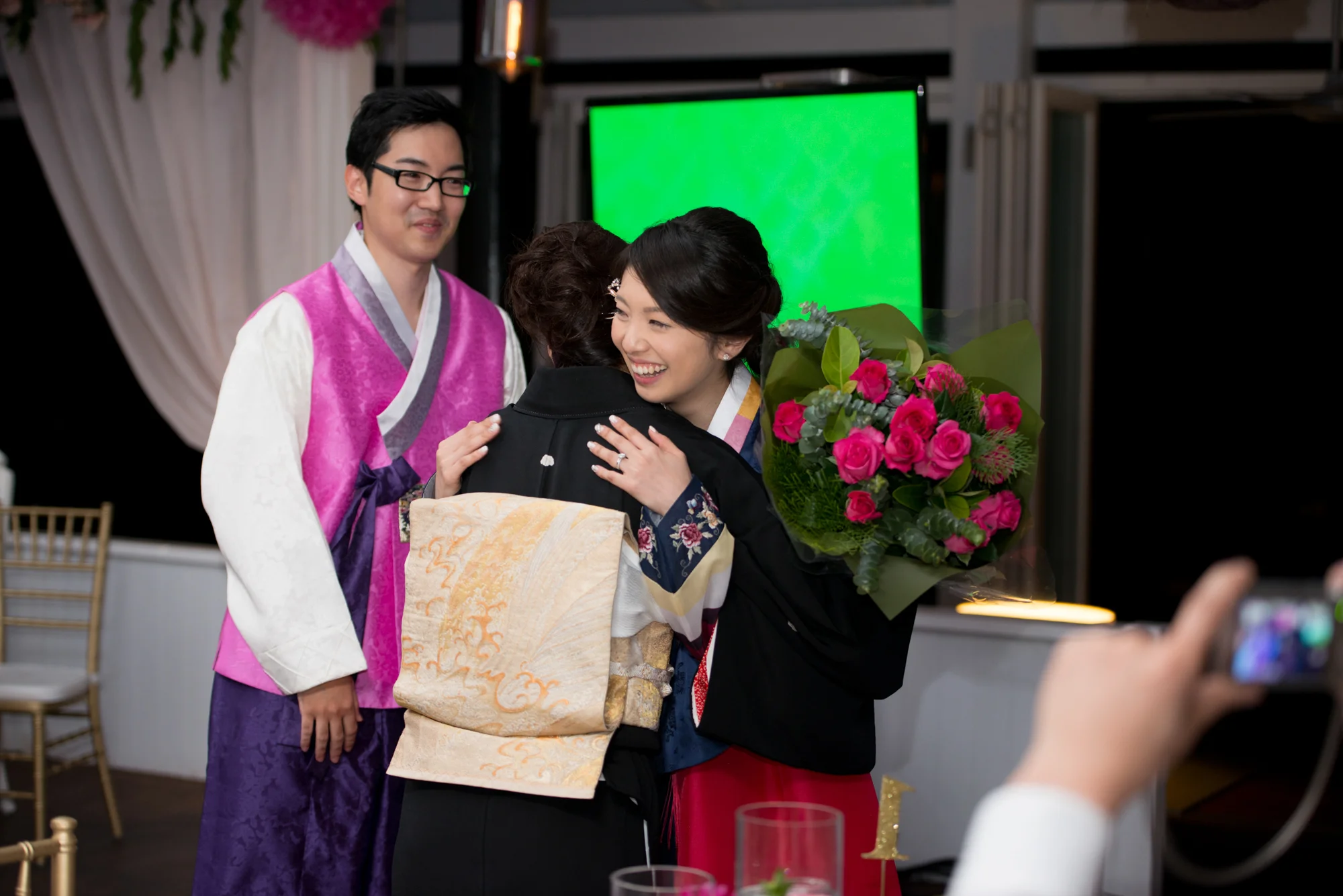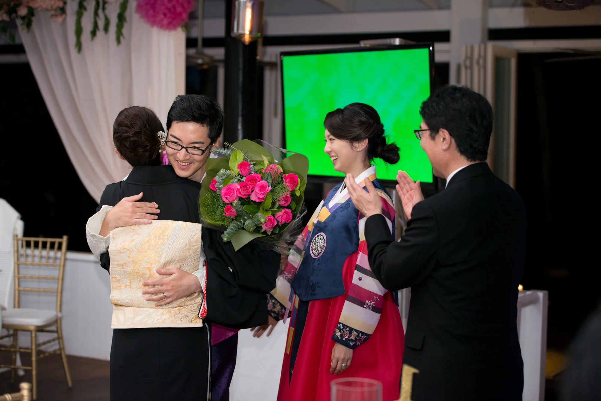 ゲストがお食事を楽しまれている間に、新郎新婦様は、ご両家のご親族にサプライズでお召しになるチマチョゴリに、お色直しに出られました。