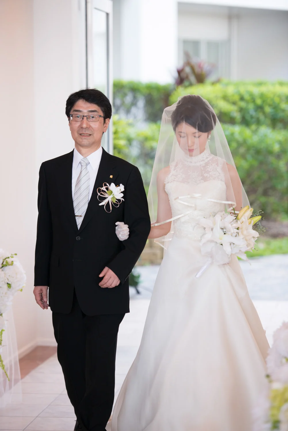 入室時は、別々に歩まれたヴァージンロードを、今度はお二人で腕を組んで、歩まれます。