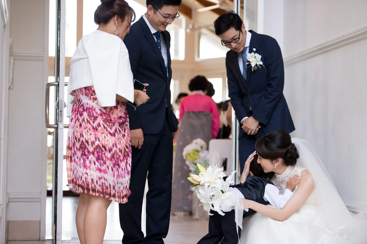 チャペルのドアを開けた瞬間、恥ずかしさで立ちすくむリングボーイに、牧師さんまでもが「頑張って!」と